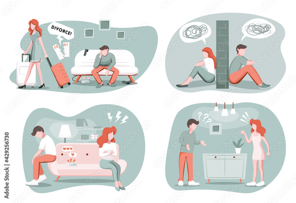 Divorce Breakup Separation Concept Set Depressed Man And Woman Divided By Stone Wall Married Couple Having Relationship Problem Vector Illustration In Flat Style Stock Vector Adobe Stock